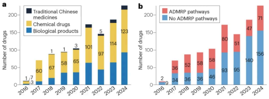 2016-2024年NMPA批准上市新药数量:a, 按药物类型分类; b, 按药物审评审批类型分类; c, 通过药品加快上市注册程序批准情况,“PRA”指优先审评审批、“CA”指附条件批准、“BTD”指突破性治疗药物、“At least one type”指通过至少一种药品加快上市注册程序批准上市的药物;d, 按药物来源分类。