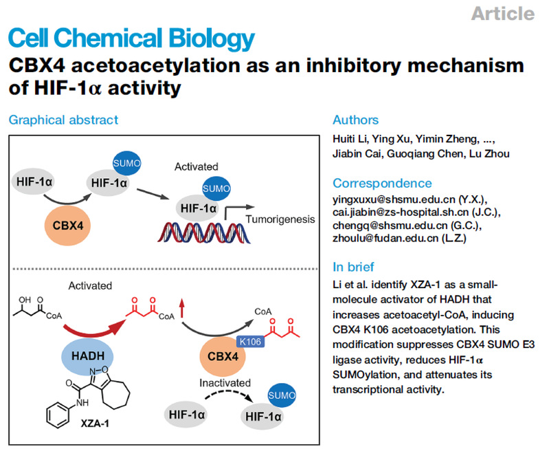 近日,熟女性交 周璐教授课题组联合陈国强院士及樊嘉院士/蔡加彬副主任医师团队发现了一种调控HIF-1α转录活性的新机制,相关工作以“CBX4 acetoacetylation as an inhibitory mechanism of HIF-1α activity”为题在线发表于Cell Chemical Biology杂志。