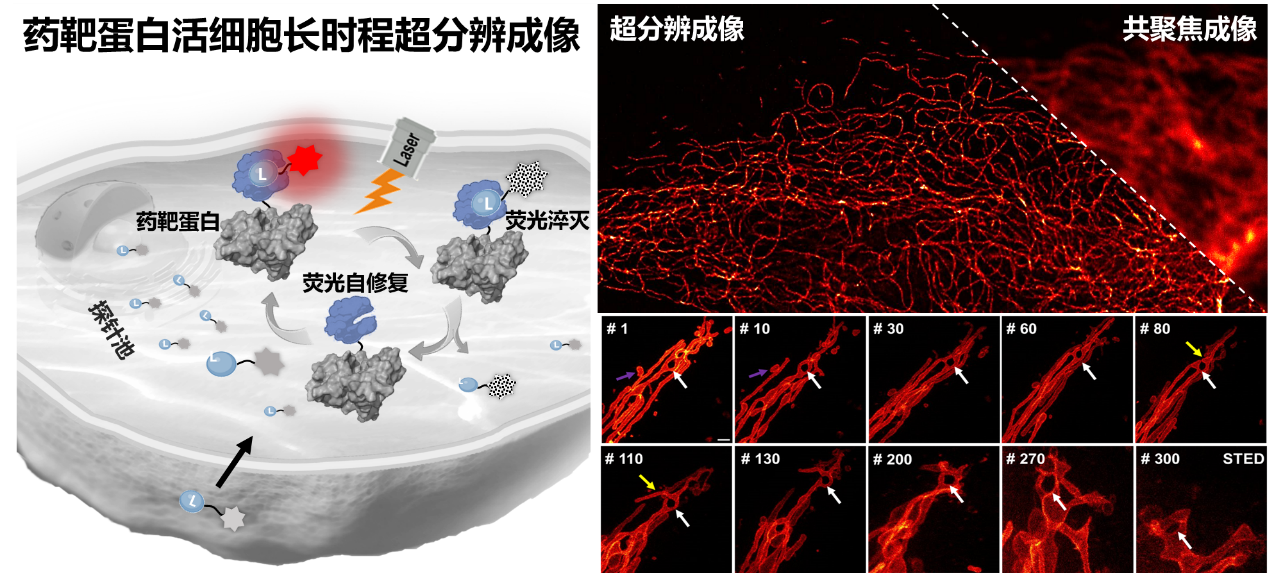 该体系在 STED、SIM、SMLM 等多平台超分辨显微技术中均表现出卓越的长期成像与单分子示踪能力,显著拓展了活细胞内药物靶标的可视化维度,为解析药物靶标的结构—功能关系、作用机制动态演变和药效动力学过程提供可视化新平台和新方法。